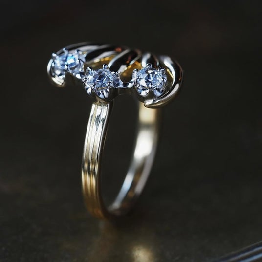 19世紀英国ヴィクトリア時代の装飾様式に着想を得て生まれたコレクションで、当時の重厚感と曲線美を現代の造形で表現しています。山高のローズカットが主流であった時代背景に対し、ファセットカットのルースを逆さにセッティングすることで、よりクラシカルな印象を際立たせています。