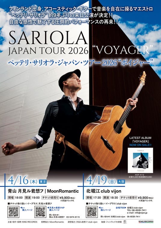 新作『VOYAGER』を携えて、ペッテリ・サリオラの来日公演が決定。2017年以来約9年ぶりとなる待望の来日公演は、4月16日に東京・青山 月見ル君想フ、4月19日に大阪・北堀江club vijonにて2公演のツアーとして開催される。自由な感性で弾きまくる圧倒的なパフォーマンスの再来に期待してほしい。チケットは2月7日12時よりプレイガイドおよび各会場にて販売開始。アコースティック・ギターの可能性、その“ネクスト・レベル”を感じ取ることができるこの機会をお見逃しなく!
