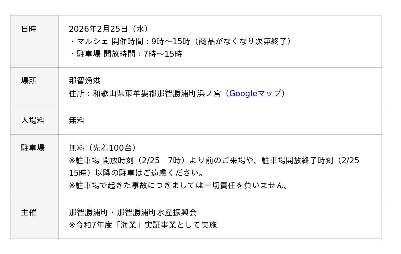 ▶日程:2月25日(水)▶入場無料▶駐車場無料▶内容:簡単な体験コーナー、グルメコーナー、ショップコーナー等▶主催:那智勝浦町・那智勝浦町水産振興会(令和7年度「海業」実証事業として実施)