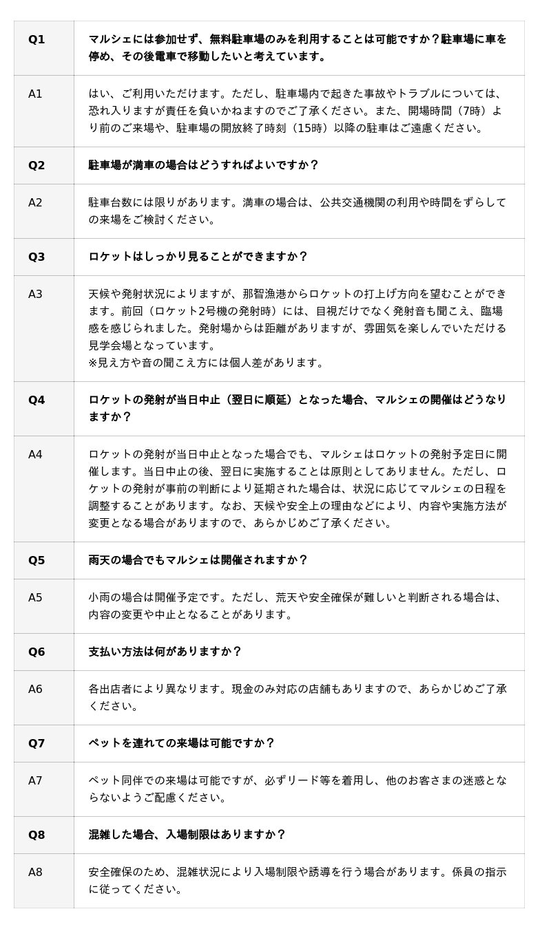 2026年2月25日(水)、那智漁港にて「ロケット見学 海産マルシェ」を実施いたします。当日は、打ち上げ予定のカイロス3号機を那智漁港から見守りながら、那智勝浦町の海産物の販売や、気軽に参加できる体験コーナーを予定しています。