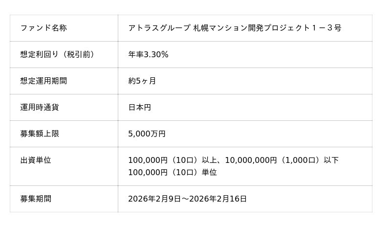 貸付型クラウドファンディング「Funvest」2/9より新ファンド「アトラスグループ 札幌マンション開発プロジェクト1-3号」の募集開始