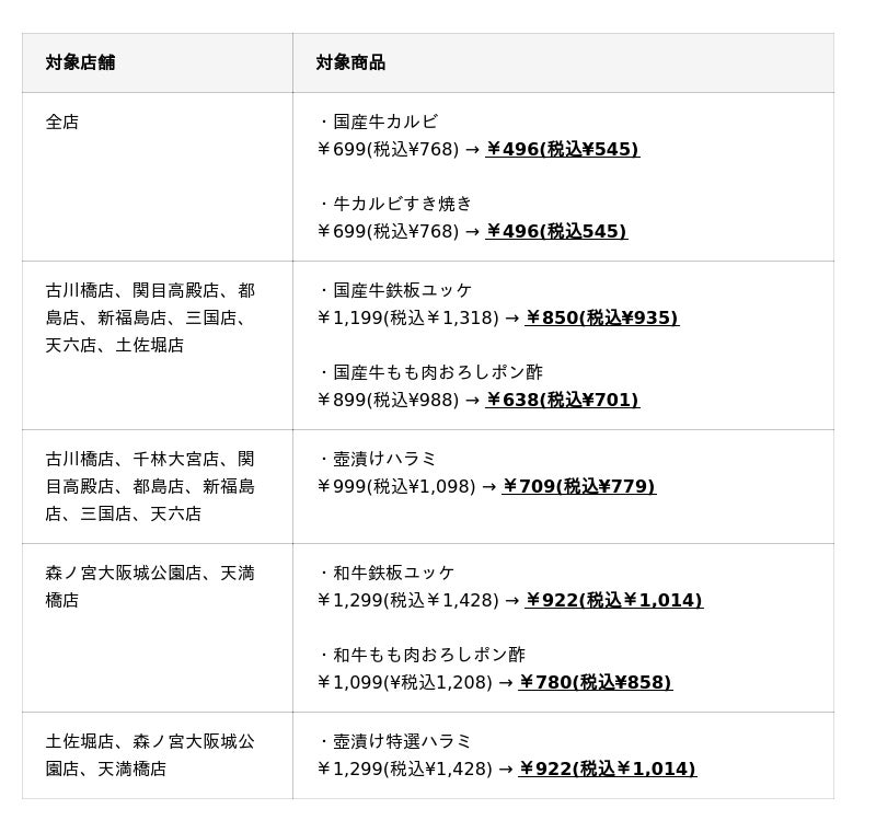 ・千林大宮店のみ、「国産牛カルビ」「牛カルビすき焼き」「壺漬けハラミ」の3種が対象となります。