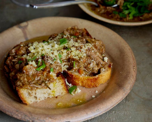 トースターで軽く焼いたカンパーニュに、豚スペアリブの煮込みをのせたブルスケッタ。トロトロに煮込まれた豚肉は、濃厚な旨みに野菜の甘みが溶け込み驚くほど後を引く。肉汁がしみたパンが、またおいしい。赤ワインを呼ぶ、食べこたえ満点のつまみだ。
