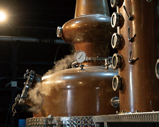 「菱田蒸溜所」(鹿児島県大崎町)では、伝統的な単式蒸留器としても高効率な連続式蒸留器としても使用できる銅製のハイブリッドスチルが活躍。焼酎造りの経験を活かしながら、特徴的なウイスキー造りに取り組む。
