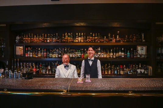 静岡県・沼津の地に創業して58年になる老舗「フランク・バー」。カウンターに立つオーナーバーテンダーの相原勝さん(左)と、店を手伝う孫の駿介さん。静岡産のウイスキーが楽しめる。
