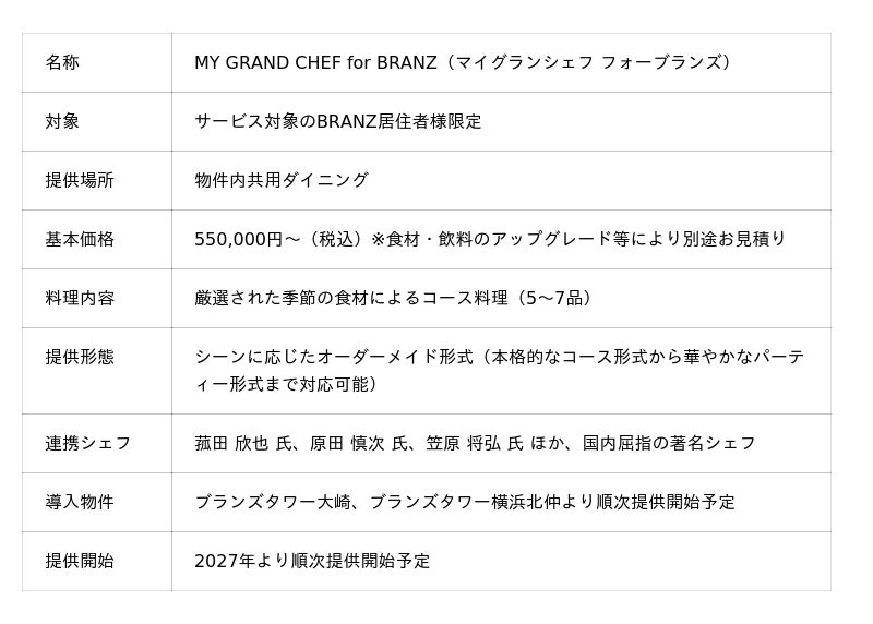 東急不動産株式会社(本社:東京都渋谷区、代表取締役社長:星野 浩明、以下 東急不動産)と、グローバル刃物メーカーの貝印株式会社(本社:東京都千代田区、代表取締役社長兼COO:遠藤 浩彰、以下、貝印)は、東急不動産の分譲マンション「BRANZ(ブランズ)」のサービス導入物件の居住者を対象に、著名シェフが赴き、完全予約制・カスタムメイドで上質な食体験を提供する新サービス「MY GRAND CHEF for BRANZ(マイグランシェフ フォーブランズ)」を導入することに合意し、提携を開始いたしました。