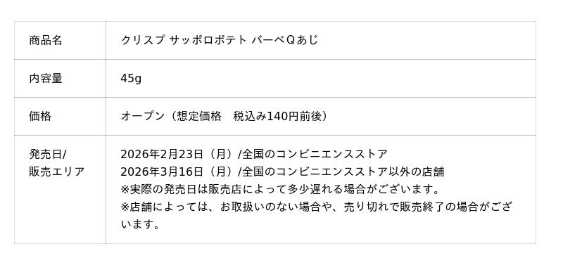 カルビー株式会社(本社:東京都千代田区、代表取締役社長兼CEO:江原 信)は、“ザクッ”とした食感が特長の成型ポテトチップス※1「クリスプ」から、「サッポロポテト バーベQあじ」の味わいを再現した『クリスプ サッポロポテト バーベQあじ』を2026年2月23日(月)から全国のコンビニエンスストア先行で期間限定発売します(2026年4月上旬終売予定)。コンビニエンスストア以外の店舗では、2026年3月16日(月)から数量限定発売します。