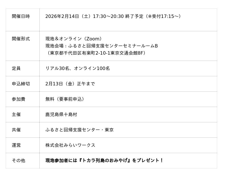 株式会社みらいワークス(本社:東京都港区、代表取締役社長 岡本 祥治)は、2026年2月14日(土)十島村から受託した事業の一環で、有楽町(東京都)とオンラインで移住セミナーを開催します。