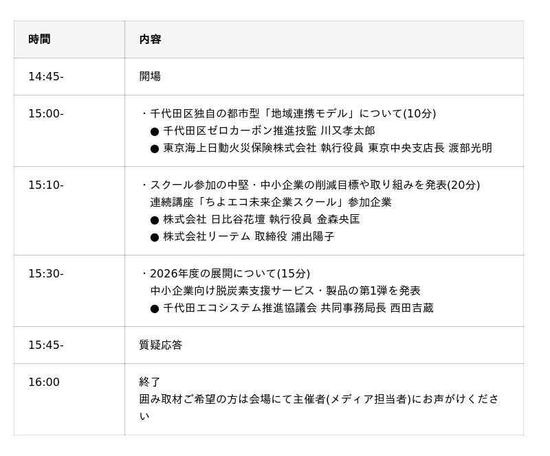 千代田区は、全国初となる「都心型・地域連携モデル(千代田モデル)」の発足を宣言します。2025年度に実施した「ちよエコ未来企業スクール」参加企業によるCO2削減目標の公開に加え、「中小企業向けの脱炭素支援サービス・製品」第1弾を2026年3月2日(月)14時から発表いたします。