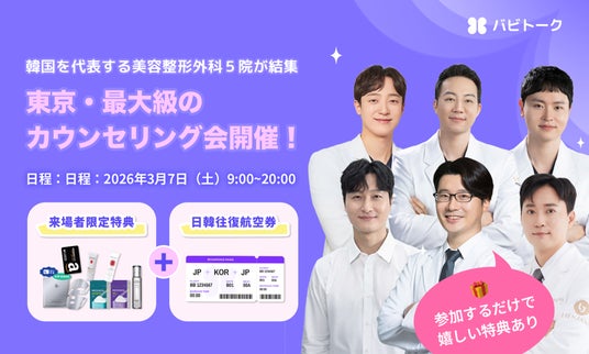 (バビトーク=2026年02月09日)韓国の美容医療プラットフォーム「バビトーク」は、 韓国の有名美容外科・皮膚科5院と提携し、韓国美容施術に関する情報を提供するオフライン相談会を、2026年3月7日(土)、東京・TKP新橋汐留カンファレンスセンター10Aホールにて開催します。相談会は午前9時から午後8時まで実施される予定です。