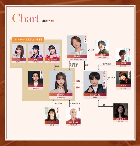 【STORY】駆け出しアイドルの南瀬天(阪口珠美)は、早乙女杏夏(上原あまね)を筆頭とする「LUNA NEST」のメンバーからの嫌がらせに耐える日々を送っていた。そんな中、天は偶然出会った人気俳優・宝生千秋(NOA)の導きでドラマの代役を務めることに。千秋は純粋無垢な天に興味を持ち、悪友・朝倉浬(阿久根温世)からも、“天を落とせるか”賭けを持ち掛けられ、イタズラに天に近づく。だが、母である奈津美(遊井亮子)に金をせびられていた所を天に助けられ、千秋は次第に天の純真さに惹かれていく。