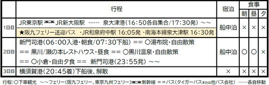 ※東京駅~泉大津港まではお客様各自でご移動となります。新大阪駅~泉大津港までは旅行代金に含まれておりません。お客様各自ご負担となります。