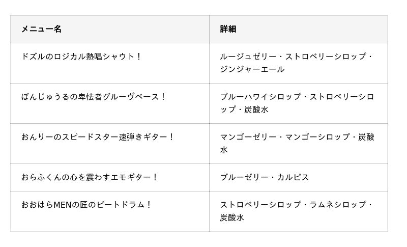 今回の描き下ろしイラストでドズル社メンバーがそれぞれ担当している楽器や、各メンバーをイメージした個性豊かなコラボドリンクが登場!