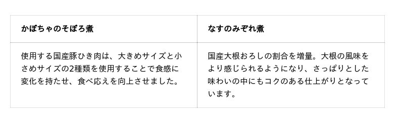 発売以来、お客様から寄せられたご意見などを分析し、商品価値のさらなる向上を目指した改良を検討してきました。このたび、発売から2年半が経過するシリーズのうち2品について、リニューアルを実施します。本リニューアルでは3種の「こだわりのだし」によるうま味の増強や、具材の満足感向上を図りました。