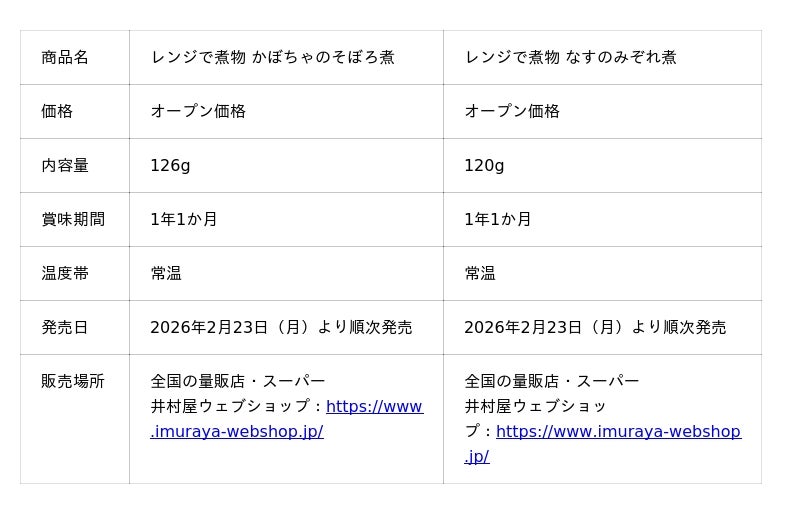 井村屋株式会社(本社:三重県津市高茶屋七丁目1番1号、社長:岩本 康)は、電子レンジで簡単に副菜が作れるパウチ容器入りの調味料「レンジで煮物」シリーズより、『レンジで煮物 かぼちゃのそぼろ煮』『レンジで煮物 なすのみぞれ煮』のリニューアル商品を、2026年2月23日(月)より全国にて順次発売します。