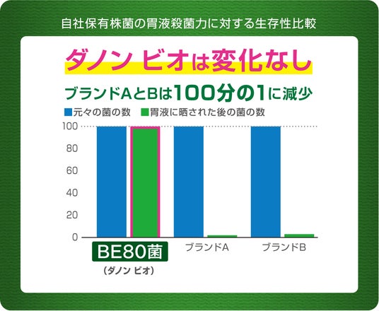 ※1: 当社従来品比。第三者機関において胃の環境を模した実験器具を用いて、BE80菌と当社のブルガリカス菌との胃液殺菌力に対する生存比較試験の結果。