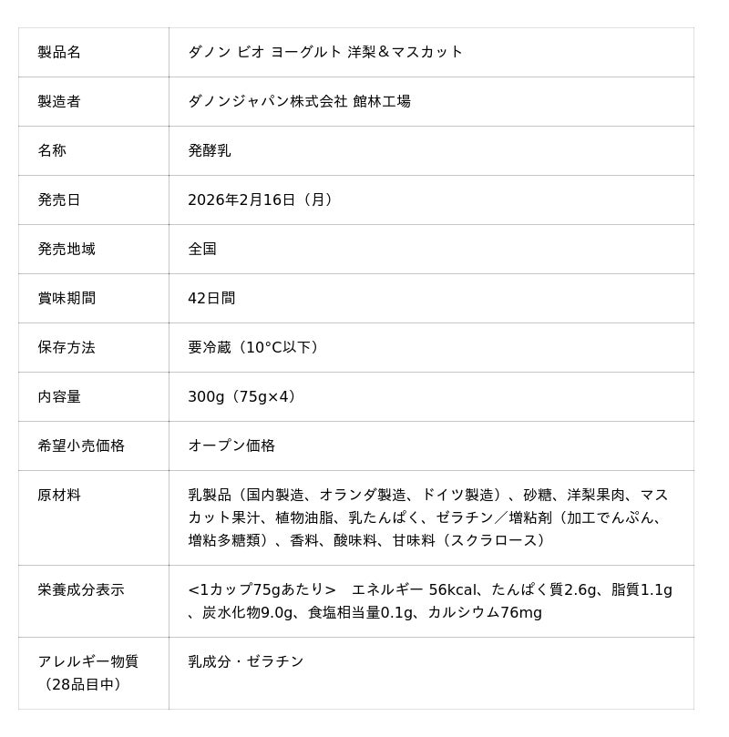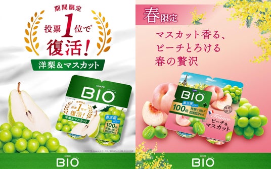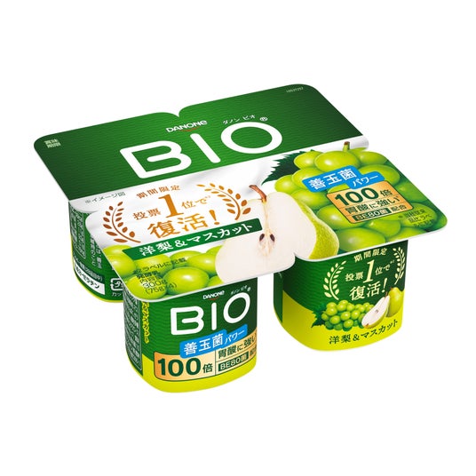 また同時に、2025年に実施したダノン ビオの「復活希望フレーバー」を選ぶ投票※3において、最も多くの支持を集めた2024年の秋限定フレーバー「洋梨&マスカット」を期間限定で復刻販売します。「洋梨&マスカット」は、口に入れるとまろやかな酸味とマスカットの香りが広がり、洋梨のジューシーな果肉を食べた後にはマスカットと洋梨の香りがほのかに残る、奥行きのある味わいが特長の製品です。投票の結果、2位の製品と7%差という僅差で1位を獲得し、今回復刻販売をするに至りました。