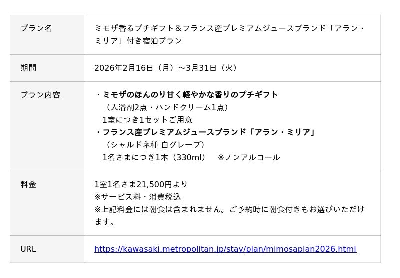 ホテルメトロポリタン 川崎(運営/日本ホテル株式会社、総支配人/金田 文典)は川崎駅周辺がミモザの黄色に染まる毎年恒例のイベント「MIMOSA FESTA 2026(2026年2月16日(月)~3月22日(日)開催)」に連動した宿泊プランを、期間限定で販売いたします。