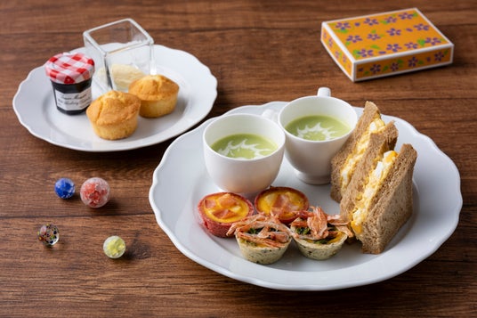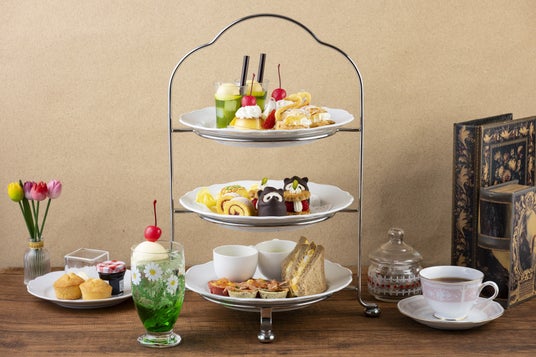 アフタヌーンティースタンドの一段目には喫茶店の定番ドリンクであるクリームソーダを模したナタデココ入りゼリー。ストローまで食べることができる見た目も可愛らしい一品です。またクレームパティシエールをたっぷりと詰めたスワンシューも時代を超えて愛されるレトロメニューの定番です。二段目にはどこか懐かしさを感じるぽんぽこたぬきケーキが登場。愛らしい見た目のバタークリームケーキです。三段目にはふわふわのたまごサンドウィッチや2種のミニサイズキッシュをご用意いたしました。