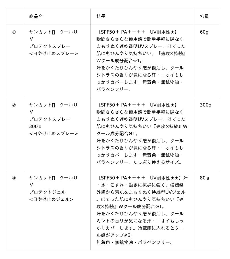 ※1 UV スプレー:メントール、乳酸メンチル UV ジェル:メントール、カンフル ※2 メントール