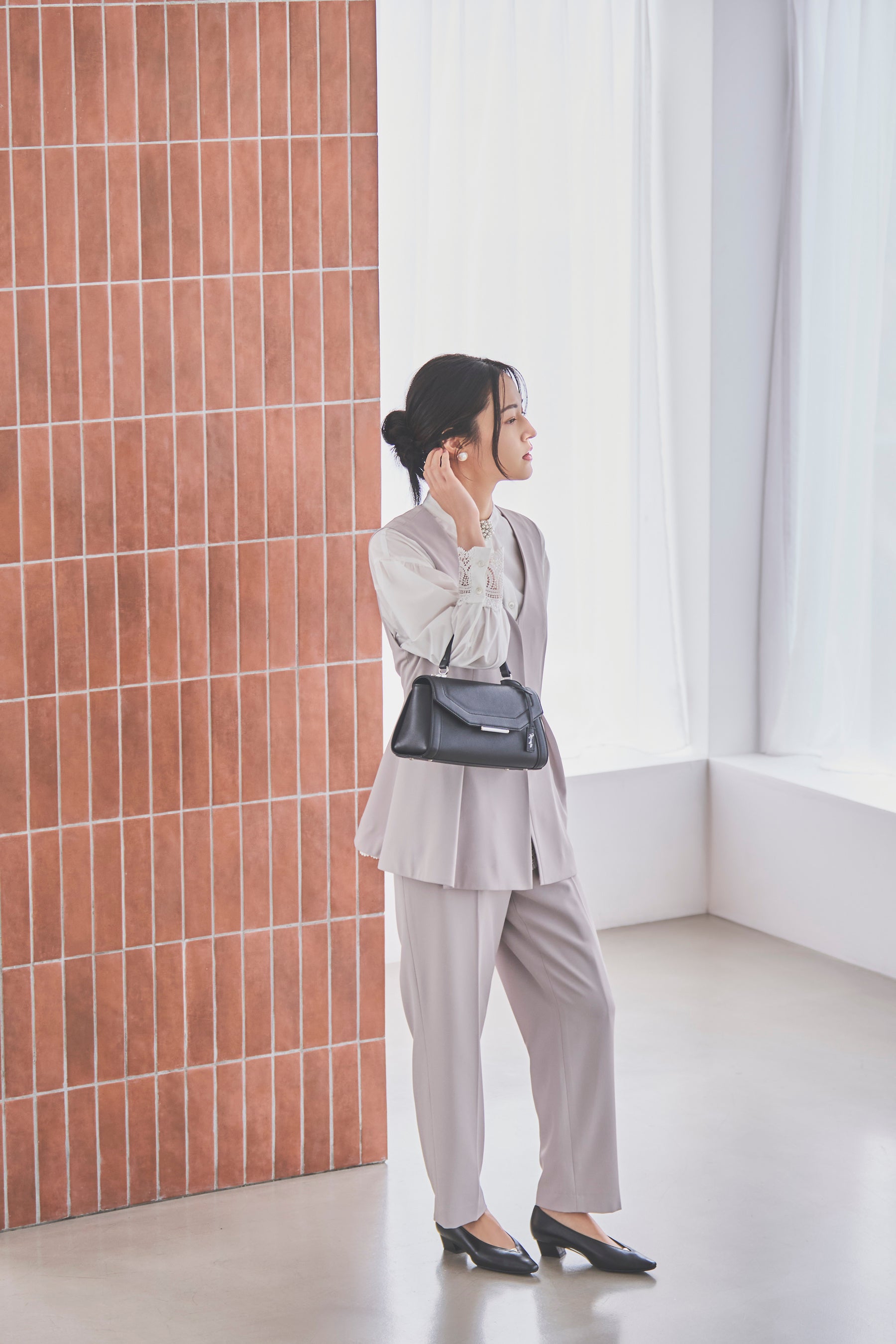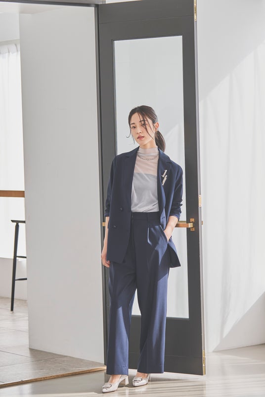 ジオメトリック風なアシンメトリーバックルで、足元にさりげない個性を。ネイビーのスーツスタイルに、クールなライトグレーが抜けをつくり、今っぽく更新してくれます。