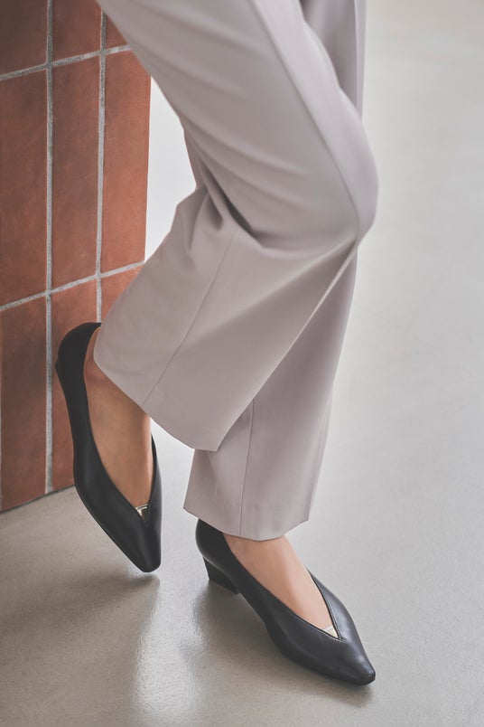 ポインテッドトウに直線的なメタルのデザインが、足元をすっと引き締めミニマルなアクセントに。6.5cmのブロックヒールは安定感があり、きちんとした場面でも安心です。