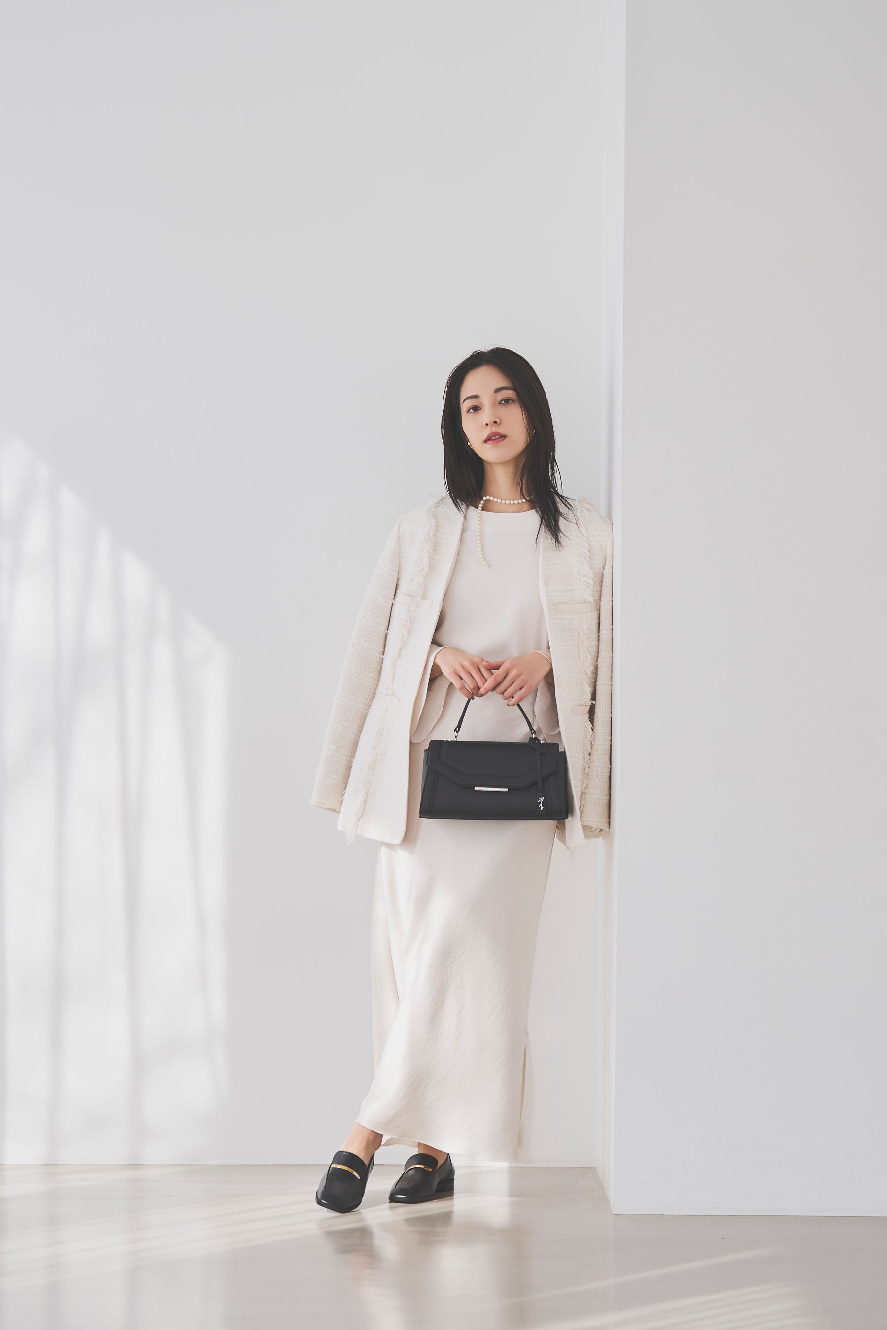 端正なフォルムが足元をすっきり見せ、ハレの日にも自然になじむローファー。ツイードジャケットとワントーンでまとめたスタイルに合わせれば、きちんと感の中に程よい抜けを作れます。汎用性の高いローファーは、シーンを選ばず活躍する一足です。