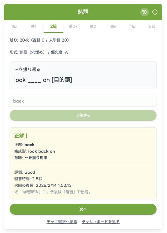 入力して思い出す想起型×間隔反復スケジューラで復習を自動化。単語1,300/熟語500(2級)を優先度A/B/Cで学習可能