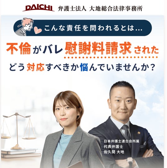 弁護士法人大地総合法律事務所(東京都港区)は、このたび不貞慰謝料を請求された方向けの相談体制を強化しました。あわせて、専用相談LPも公開しています。