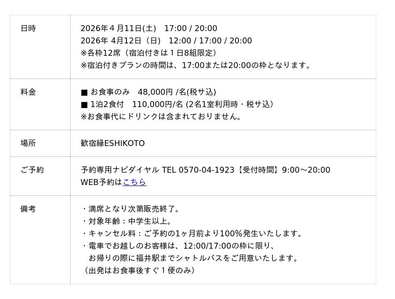 このたび、株式会社アクアイグニス(本社:東京都中央区、代表取締役:立花哲也)が運営する、福井県永平寺町の温泉オーベルジュ「歓宿縁 ESHIKOTO」では、大阪の名店「鮨 三心」と、同施設内「日本料理 えん」による、2日間限定のコラボレーションイベントおよび宿泊付き特別プランを販売いたします。本プランは、1日8組限定の宿泊付きプランのほか、日帰りでご利用いただけるお席もご用意しております。
