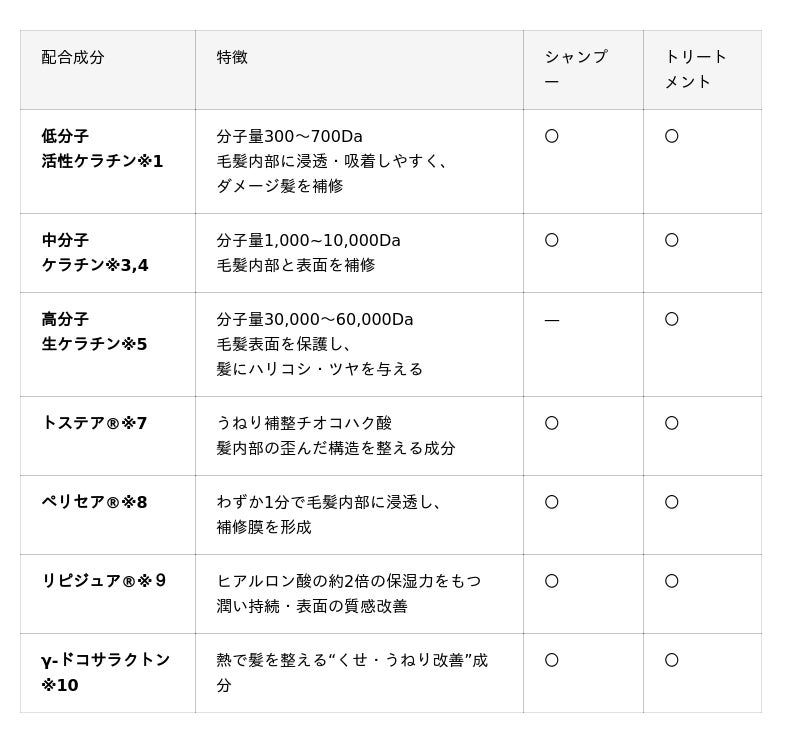 ※1加水分解ケラチン(羊毛)※2 ※1,3~10を指す ※3 ステアルジモニウムヒドロキシプロピル加水分解ケラチン(羊毛) ※4 加水分解ウールキューティクルタンパク ※5 ケラチン(羊毛) ※6 ヘマチン ※7 アミノエチルチオコハク酸ジアンモニウム。「トステア(R)」はオリエンタルケミカル株式会社の登録商標 ※8 ジラウラミドグルタミドリシンNa。「ペリセア(R)」は旭化成ファインケム株式会社の登録商標 ※9 ポリクオタニウム-65。「リピジュア(R)」は日油株式会社の登録商標 ※10 γ-ドコサラクトン ※11 ココイルメチルタウリンNa、※12ラウロイルメチルアラニンNa、※13コカミドプロピルベタイン、ラウラミドプロピルベタイン※14ラウリミノジプロピオン酸Na