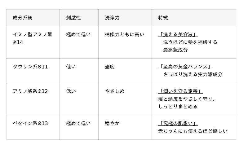 洗浄成分はタウリン系※11・アミノ酸系※12・ベタイン系※13・補修のイミノ型アミノ酸系※14等のミックス。毛髪補修の土台として理想的な洗浄力と低い刺激性を実現しています。