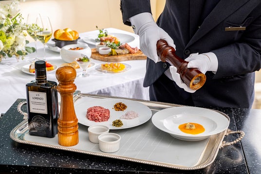 より洗練された前菜前菜はこれまでのビュッフェ形式から、人気の品を盛り合わせたシャルキュトリープレートに変更し、ゆっくりと食事を満喫していただけるスタイルに。さらに、1種類追加でご注文いただける選べる前菜をご用意いたしました。おすすめはお客様の目の前で仕上げる和牛のタルタル。低温調理で丁寧に下準備をした和牛を、いぶりがっこなど7種類の食材と合わせ、揚げ立てのフライドポテトとともにご提供します。目の前で繰り広げられるパフォーマンスと、フレッシュな味わいをご堪能ください。