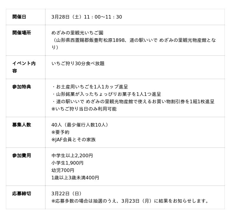 JAF(一般社団法人日本自動車連盟)山形支部(支部長 高橋 修)は、めざみの里観光いちご園(山形県飯豊町)で、春の訪れを感じる「いちご狩り体験」を開催します。