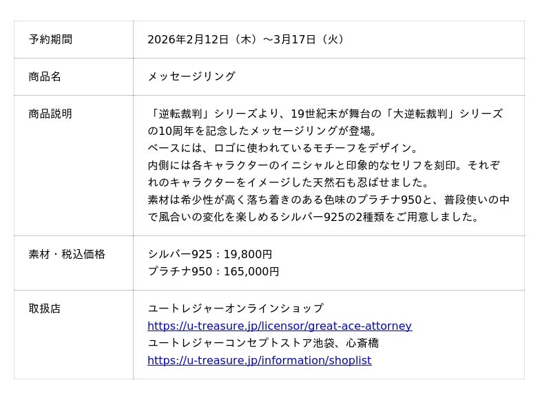 株式会社ユートレジャー(本社:東京都新宿区、代表取締役社長:青木 興一、株式会社ケイ・ウノの連結子会社)は、2025年7月9日で10周年を迎えた「大逆転裁判」シリーズとコラボレーションした「メッセージリング」の予約受付を2026年2月12日(木)~3月17日(火)の期間、ユートレジャーオンラインショップ、ユートレジャーコンセプトストア池袋・心斎橋にて行います。