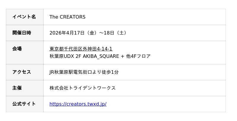 『The CREATORS』は、”クリエイターと企業が繋がれる場”をコンセプトにエンタメ業界の定番イベントを目指して進化し続ける、業界最大級の交流イベントです。