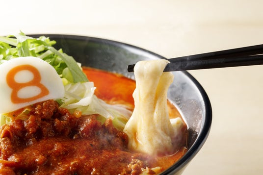 フレッシュなバジルソースに合わせて、8番らーめんの唐麺には全く新しい、春らしくさっぱりとした特製レモンソースに仕上げました。8番の太麺を混ぜてふわっと広がる爽やかな香りが特徴です。