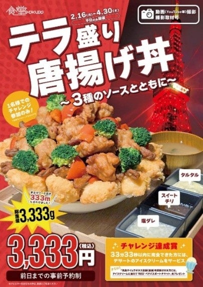 東京タワーの高さ333mにちなんだ総重量3,333gの超大盛りメニュー「テラ盛り唐揚げ丼 ~3種のソースとともに~」の販売を開始します。