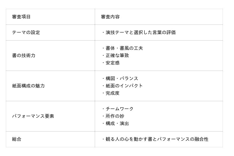 審査員は書道パフォーマンス甲子園でも活躍する高校の指導教員です。審査内容は以下のとおりです。