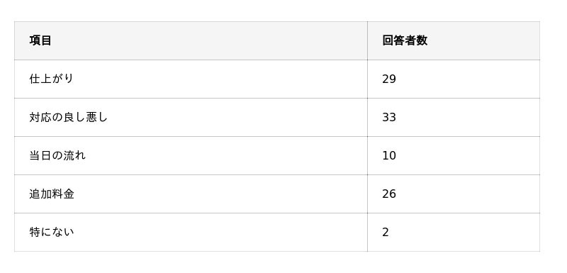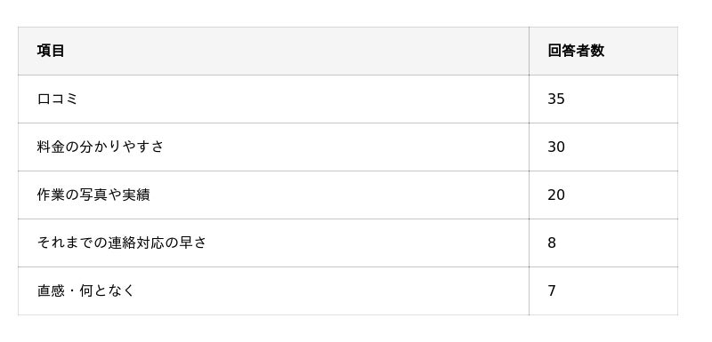 - 依頼をする最後の後押しになる要素は「口コミ」「料金の分かりやすさ」「作業の写真や実績」。