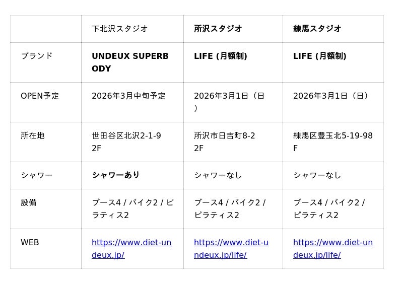 株式会社フィットクルーは2026年3月、下北沢・所沢・練馬に女性専用ジム3店舗をオープン。本格コースの「UNDEUX SUPERBODY」と月額制の「LIFE」を展開。地域の女性の美をサポートします。