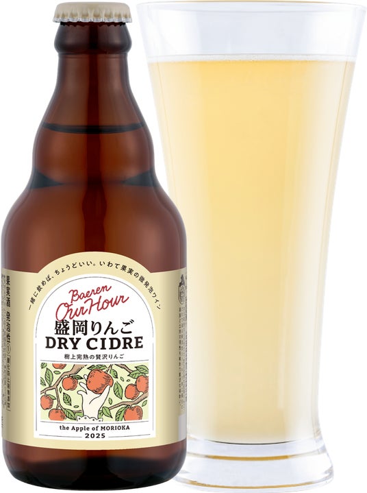 この度、令和7年度に支援している株式会社ベアレン醸造所(代表取締役社長:嶌田 洋一)による、盛岡りんごを100%使用した新商品「ベアレン Our Hour 盛岡りんごドライシードル」が令和8年2月2日(月)に発売されました。今回の開発は、拡大を続けるシードル市場を活用することで、盛岡りんごの魅力を県内外へ広く発信し、農産物の付加価値向上と地域ブランドの認知度向上を目指したものです。株式会社ベアレン醸造所は、岩手県内で最も多くのシードルを生産しており、10年以上にわたり培ってきた果実酒製造のノウハウを惜しみなく注ぎ込みました。地元農家から直送された完熟りんごを一つひとつ丁寧に搾汁し、土地が育てた個性、ありのままの「テロワール」を最大限に引き出した、フレッシュでドライな味わいの微発泡ワインに仕上げています。