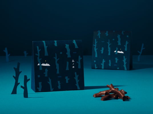 薄く焼いたクレープ生地を砕いたフィアンティーヌと、ローストアーモンドを細かく刻み、香ばしいパイを混ぜ込んだ、サクサク食感も楽しめるクランチチョコレートです。ミルクチョコレートとスイートチョコレートの絶妙なブレンドでミルキーな味わいをお楽しみいただけます。版画家 大谷一良さんの作品「森の見る夢」の木々をモチーフした3つの形のチョコレートが特徴です。