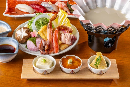 小鉢に入った3種類の前菜は、出汁のジュレを添えた「自家製豆腐」、繊細な甘さの「汲み上げ湯葉」、旬の筍と歯ごたえの良い鳴門若布の「若竹煮」をご用意。続いて「2種のお造り」をご賞味いただいた後はお1人様お1つずつご用意する小鍋が登場します。まだ肌寒さの残る季節に嬉しい、鰹節と昆布の出汁を上品にきかせた豆乳鍋のまろやかな香りに包まれながら蟹や合鴨、蛍烏賊に加え、桜葉の香りがふわりと広がる桜道明寺や生桜麩、季節野菜などを胡麻だれやポン酢と共にお楽しみいただけます。