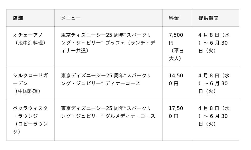 ◆ディズニーホテルコンテンツの詳細情報は、東京ディズニーリゾート・オフィシャルウェブサイト内の特設ページより ご確認ください。https://www.tokyodisneyresort.jp/hotel/topics/info/tds25th.html