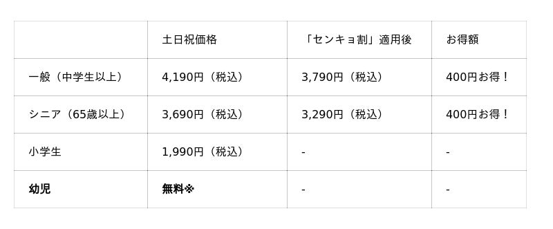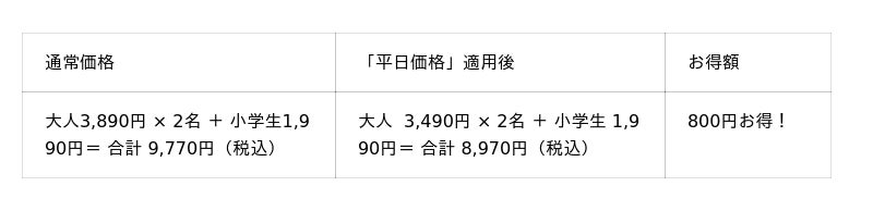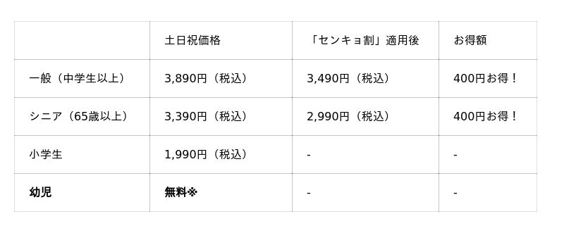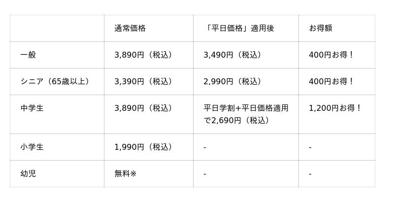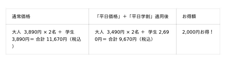 ※1「平日学割」は学生証ご提示の本人に限り有効です。「平日価格」・「平日学割」はキャンペーン開催期間中の土日・祝を除く平日のみが割引適用となります。「平日価格」の対象は一般・シニア料金のお客様です。