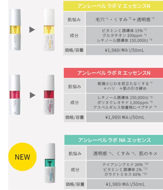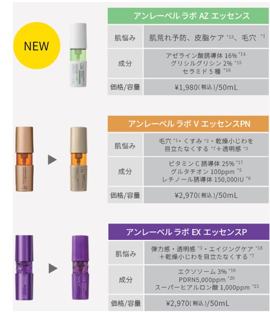 「新生unlabel LAB」は、高機能と手頃さ、続けやすさを追求。ご好評いただいている集中*¹美容液シリーズをリニューアル*²。*1 気になる部分へ集中的に使用 *2 NAエッセンスとAZエッセンスは新発売