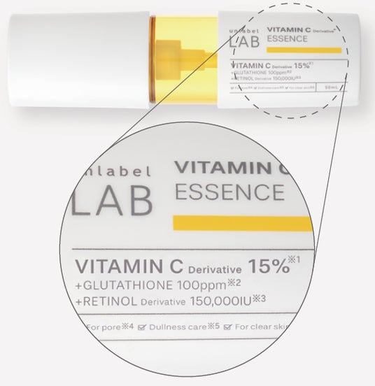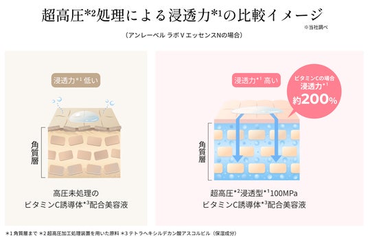 *1 製品開発において妥協せず挑み続けるブランドの開発姿勢 *2 テトラヘキシルデカン酸アスコルビル(保湿成分) *3 アンレーベル ラボ V エッセンスN *4 気になる部分へ集中的に使用 *5 機能重視/成分重視の機運を捉えた開発姿勢のこと *6 超高圧加工処理装置を用いた原料 *7 角質層まで *8自社製品比較