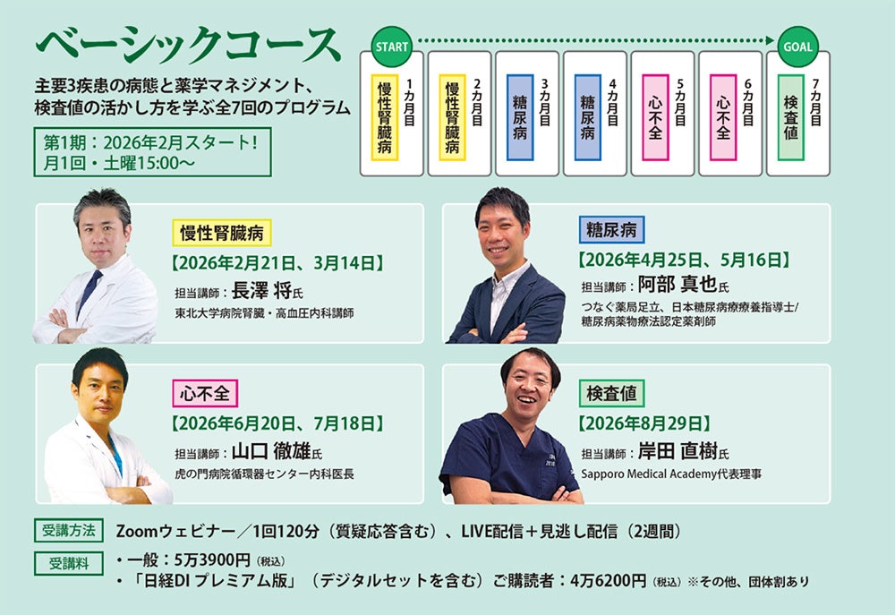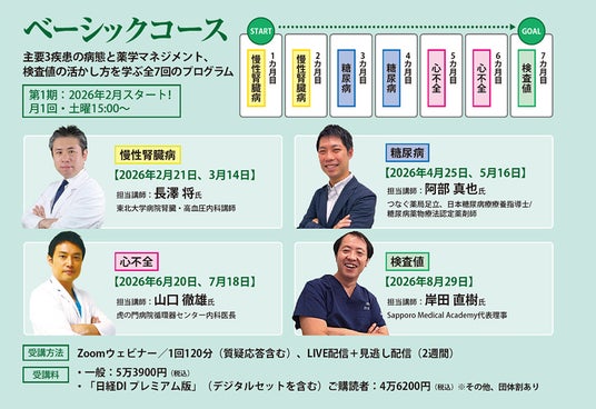 第一弾として、慢性腎臓病(CKD)、糖尿病、心不全の主要3疾患の薬学管理と「検査値の生かし方」が学べる「ベーシックコース」第1期(全7回)の受講生を現在募集中です。第1回の2月21日(土曜日)を皮切りに、毎月1回、土曜日の15~17時の時間帯でZoomウェビナーとして配信します。