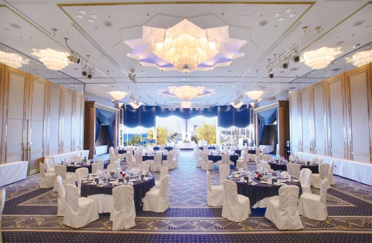 山下公園に面した開放感溢れる会場です。天井には横浜市の市花であるバラをイメージしたシャンデリア、会場内の扉のハンドルは神奈川県の木であるイチョウのデザインをあしらい、ブルーの絨毯は波のデザインとなっています。会場後方には、横浜開港の1シーンを描いた「ペルリ提督横浜上陸の図」の壁画が壁一面を飾り、文明開化の気鋭を伝える港町横浜らしい大変魅力のある空間です。